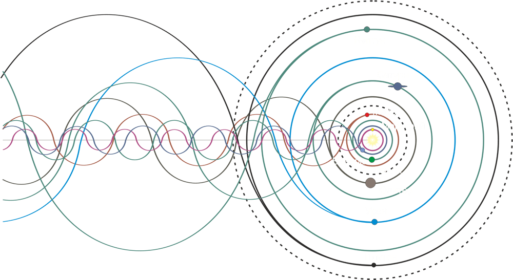 Рассматривая траектории движения Планет во времени, видна строгая периодичность во взаимном расположении Планет между собой.